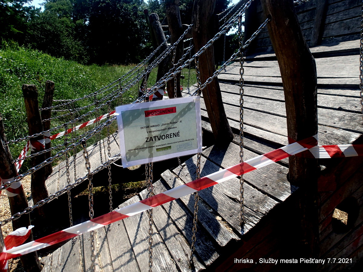 Služby mesta Piešťany ako správca detských ihrísk oznamujú občanom, že dňa 8.7.2021 na základe hlavných ročných kontrol detských ihrísk vykonaných oprávnenou osobou (č. opr. 0002/30/17/PLZ/OPR, reg.č. 0125-08/30/2014/PLZ)pristúpili k úplnému uzavretiu troch detských ihrísk.