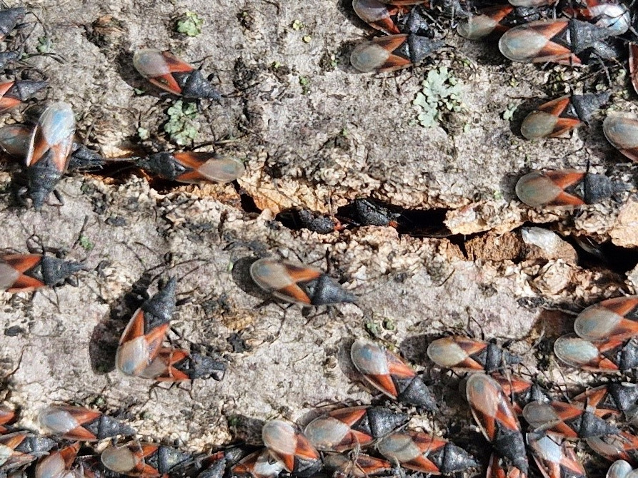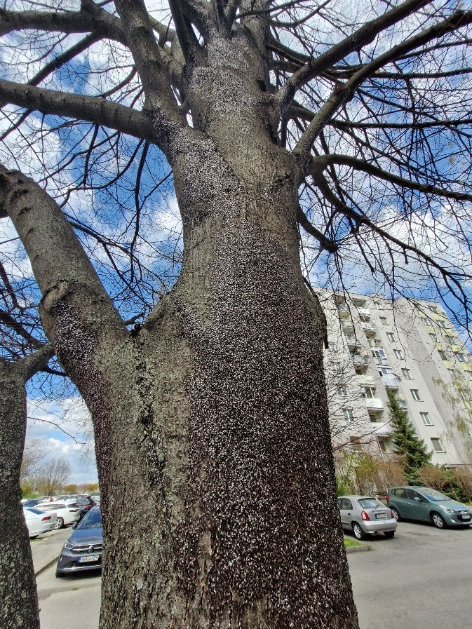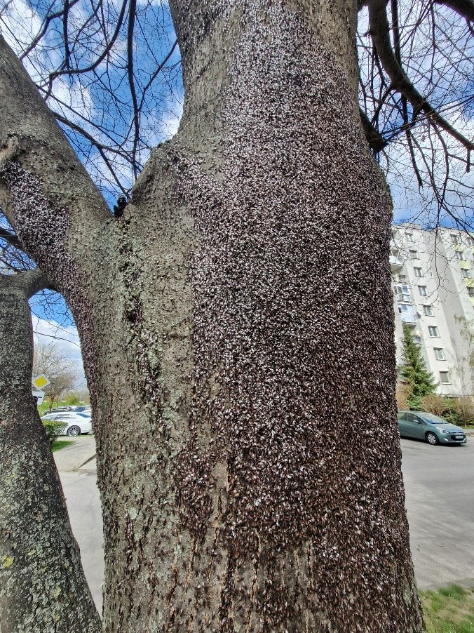 Detail kolónie ploštičiek lipových na lipe v Piešťanoch 8. apríl 2025. Foto: Hana Dupkaničová